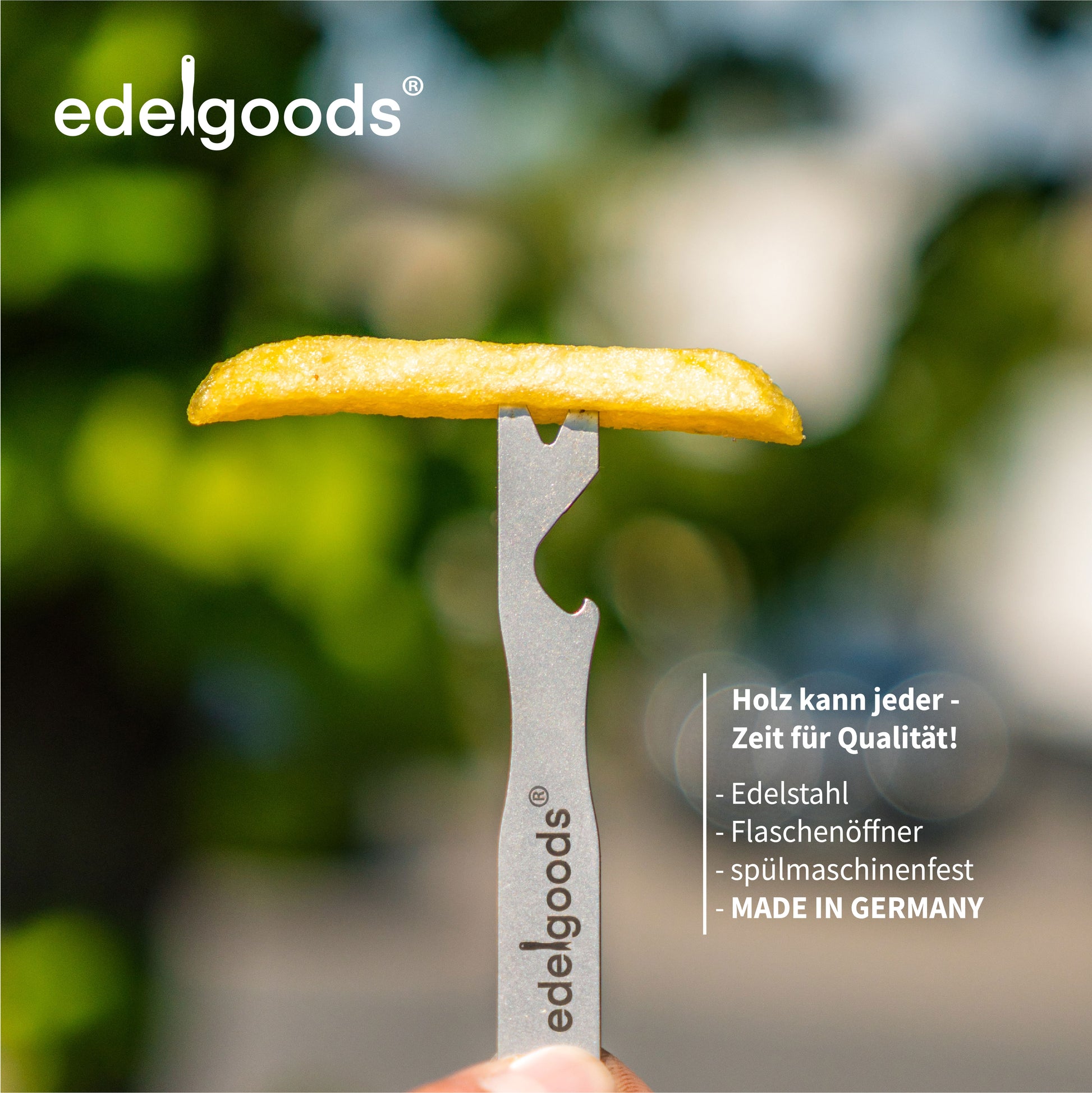 Entdecke die innovative FORX® Pommesgabel mit integriertem Flaschenöffner – das perfekte 2-in-1 Tool für alle Snack- und Bierliebhaber. Diese wiederverwendbare Gabel aus Edelstahl wird in Deutschland gefertigt und vereint Funktionalität, Nachhaltigkeit und stylisches Design. Ideal für Grillabende, Festivals, Streetfood-Stände oder als originelles Geschenk für Foodies und Bierfreunde. Die FORX® ist rostfrei, spülmaschinengeeignet und ersetzt Einweg-Pieker nachhaltig. Jetzt im praktischen Set bestellen und immer den richtigen "Hebel" zur Hand haben – für Pommes und Flaschen!