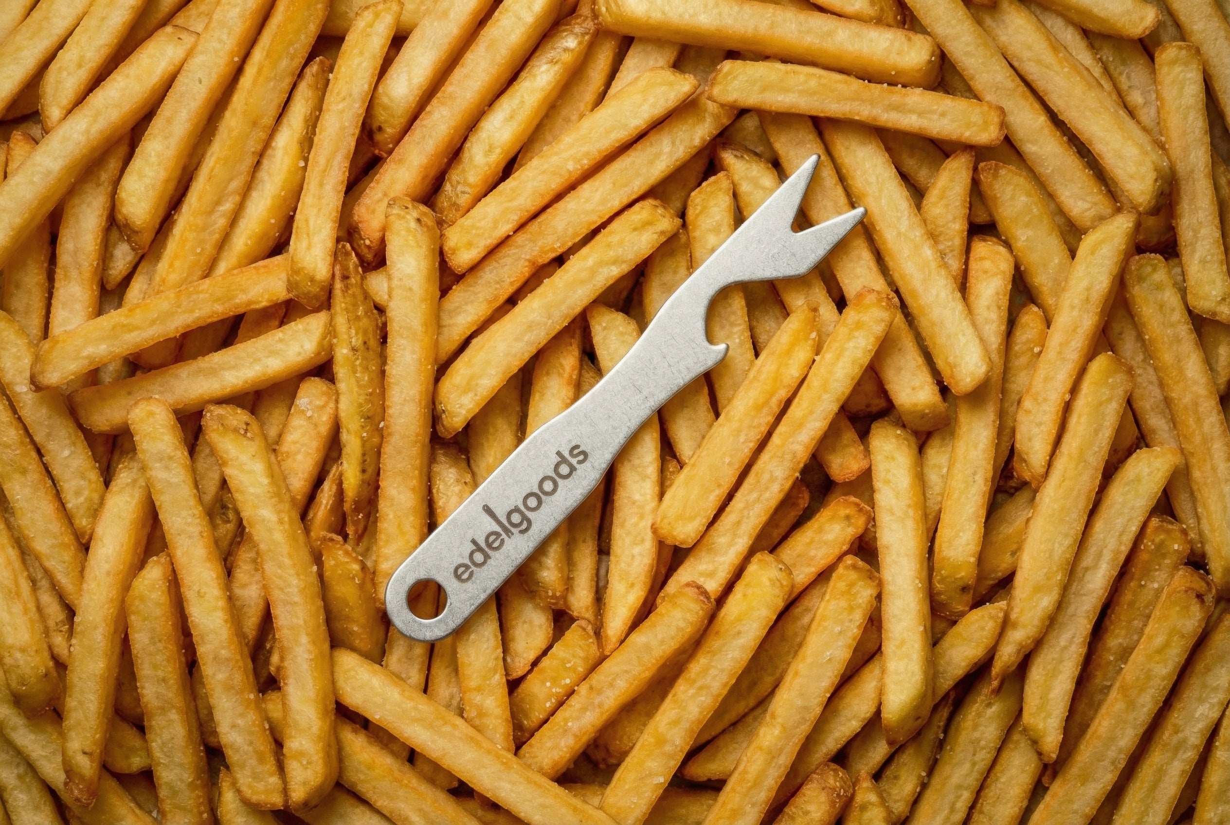 Pommesgabel & Flaschenöffner aus lebensmittelechtem, rostfreiem Edelstahl